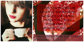 (La frase en la imagen es mi frase favorita de cada canción, me pareció mas practico que escribirla bajo la puntuación, y la frase en la barrita de abajo es el mensaje secreto de la canción, que para quienes no saben Taylor pone en todos sus álbumes y se descubren juntando las letras Mayusculas en los álbumes físicos o en Internet.)*